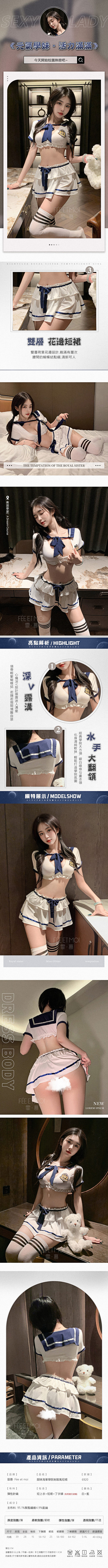 【商品簡介】 材質:95.1%聚酯纖維+4.9%氨綸 內容:短上衣x1+短裙x1+丁字褲x1 顏色:藍+白 總重:約233g 尺寸:FREE SIZE,適身高150-175cm 適體重70kg以下.....