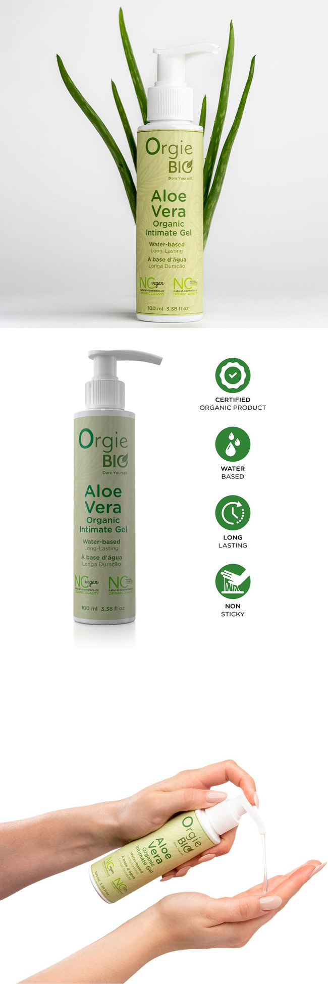 Orgie Bio 蘆薈水基私密凝膠採用庫拉索蘆薈葉汁及其他有機可持續來源的成分配製而成,不含任何化學成分——所有成分均經認證為天然純素產品。清爽不黏膩,易於清潔和沖洗。本產品經 Eco-Control™ 認證,純素且自然。