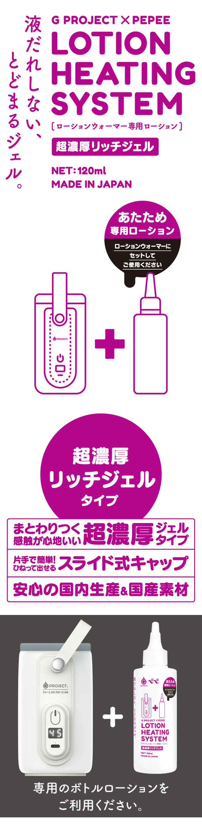 不會滴落的凝膠。可使用GPROJECT × PEPEE的LOTION HEATING SYSTEM[潤滑液加熱器]來加熱的專用潤滑液!為了可以感到更溫暖而進行了獨自開發!高粘度型,具有舒適的粘滑感。很適合長時間PLAY。單手也輕鬆!使用了只要轉一下就能擠出來的滑蓋。可安心直接與肌膚接觸的日本國產素材及日本國內生產。※亦可在常溫下使用。