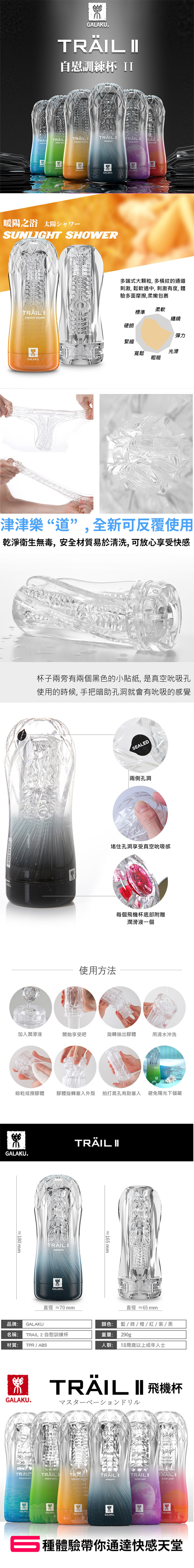 TRAIL II 自慰訓練器體驗1~6階帶您通往快感天堂的飛機杯,全採用透明膠體更柔軟更安全,並且可重覆使用方便清洗!