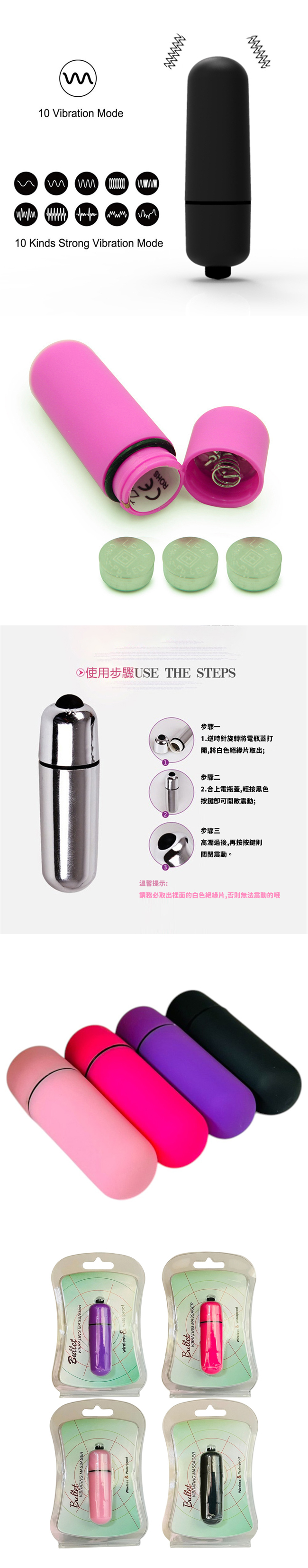 【商品簡介】 顏色:紫色、黑色、粉色、桃紅色(隨機出貨) 種類:10頻震動 材質:矽膠+塑料 包裝:吸塑卡紙包裝 電源:水銀電池3顆 商品尺寸:長6cm、直徑1.7cm.....