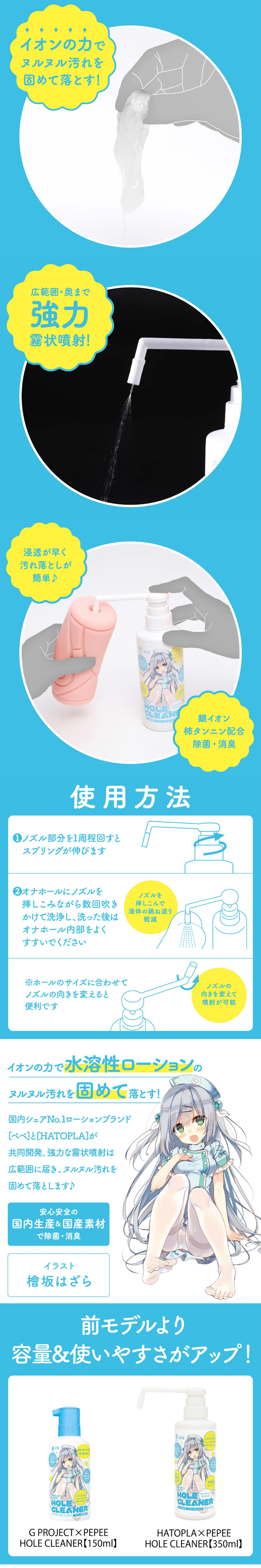 HATOPLA與日本銷量No.1的PEPE研發的水溶性潤滑液專用的倒模清洗液登場了!利用了銀離子和柿單寧的功效,安心放心的日本國內原產素材和原生產,使用它清洗常用的倒模可以除菌除臭!采用了廣範圍的噴頭設計,可以很好的讓液體到達最深處,利用銀離子的功能把污漬結合起來,用水沖洗就可以了。可以將噴管插入倒模內,洞口再小也能插進去,防止到處亂濺。噴管方向可以隨意調整,大型倒模用起來也很方便。內容量為350ml的大容量,可以盡情使用。
