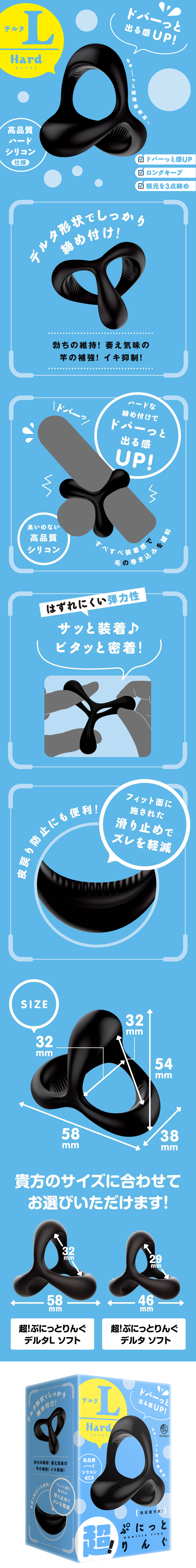 超!PUNITTO環三角洲L碼登場了!可以根據尺寸選擇哦。穿戴方便緊密貼合!以三點的形式收緊根本的硬版三角洲。無味且高品質的軟矽膠,穿戴時也不會有壓力!以三角洲的形狀收緊!維持勃起!萎靡不振時的輔助!強控!貼合面的防滑加工減少發生錯位,也可以利用與防止包皮回縮。感受夢幻般的射精快感吧!