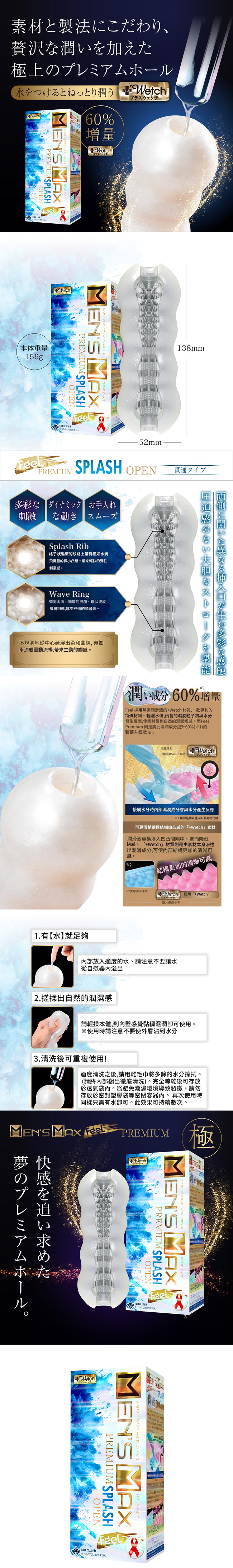 追求更刺激的真實,Feel Premium Splash 自慰套面世,濕潤成份提升60%並且由於是內部滲出的潤滑液所以你能更清晰體驗到紋路的真實觸感。