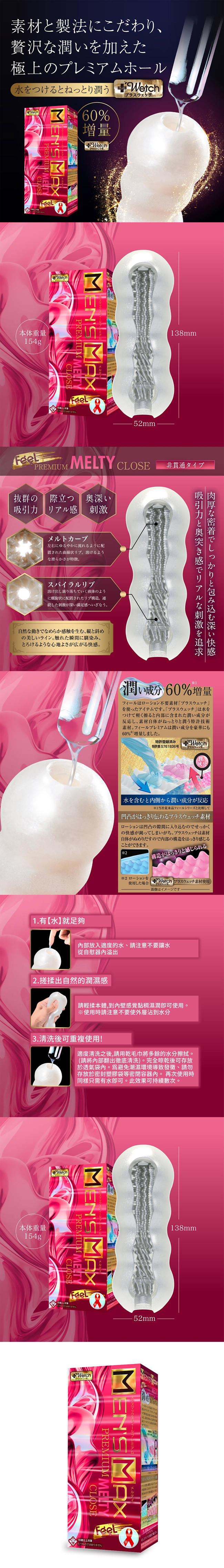 追求更刺激的真實,Feel Premium Melty 自慰套面世,濕潤成份提升60%並且由於是內部滲出的潤滑液所以你能更清晰體驗到紋路的真實觸感。