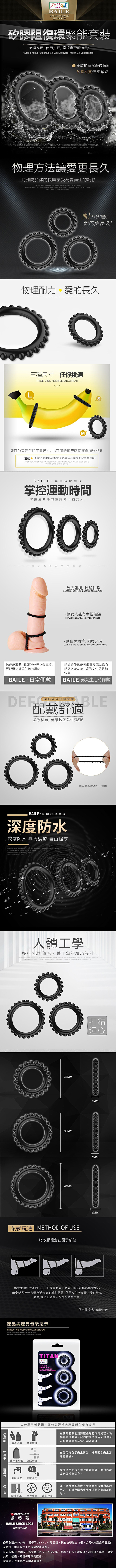 【商品簡介】 用途:男女情趣之用 材質:熱塑性彈性體 規格:穿戴型/3入 淨重:約8g 總重:約38g 尺寸:3環內/外徑分別約為1.9/3.3cm、2.4/3.8cm、2.9/4.4cm,厚度約0.5cm 外盒尺寸:12.5x19.5x2c.....