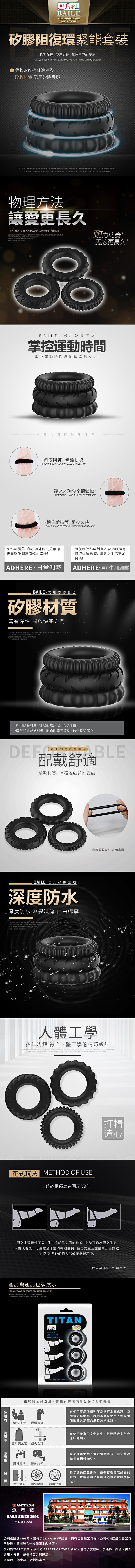 【商品簡介】 用途:男女情趣之用 材質:熱塑性彈性體 規格:穿戴型/3入 淨重:約20g 總重:約52g 尺寸:3環內/外徑分別約為1.9/3.6cm、1.9/3.9cm、2.2/4.2cm,厚度約0.9-1cm 外盒尺寸:12.7x2.5x.....
