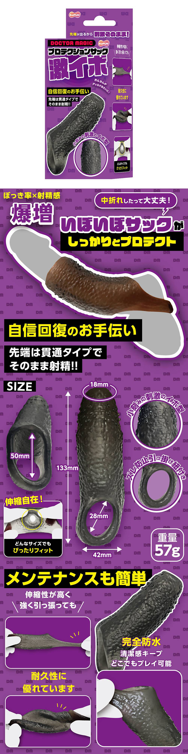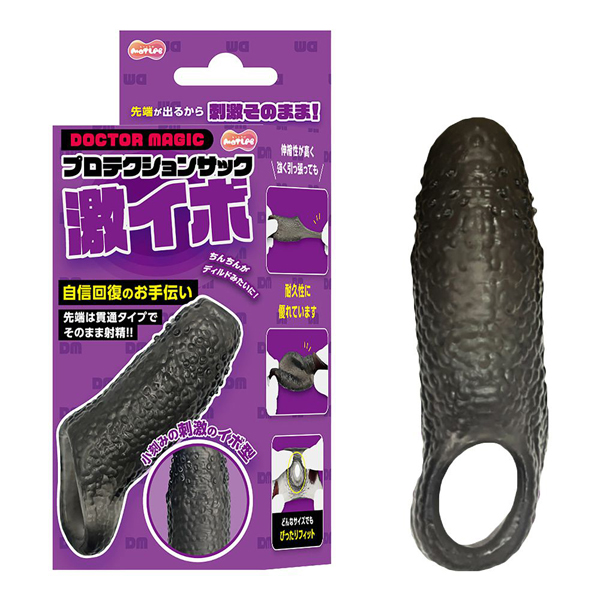 這個袋子的尖端有一個孔,可以讓你露出尖端。透過安裝它,您可以獲得比平常更粗、更堅固的桿。由於是前端露出的貫穿式,因此配戴者可以親自體驗樂趣,也可以直接發射。 「Geki Ibo」的表面有無數個隨機排列的疣。每一次劃動都會刺激伴侶的內壁。它帶有一個掛鉤,因此您不必擔心它在玩耍時掉落。