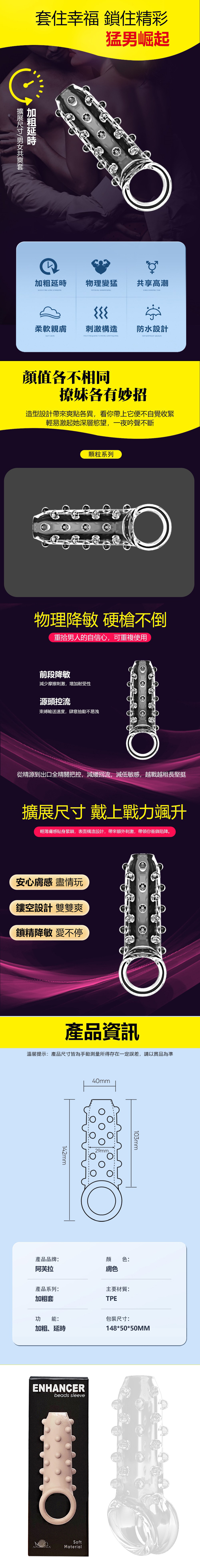 【商品簡介】 加粗延時鎖住幸福 顆粒型刺激構造設計 物理降敏。增加你的自信力 鏤空設計,快感不減.....