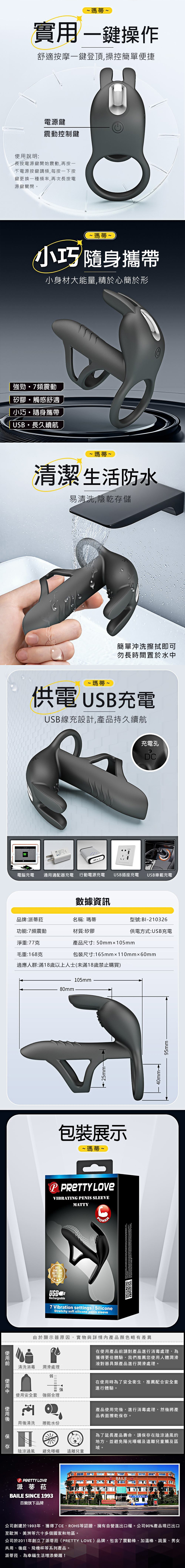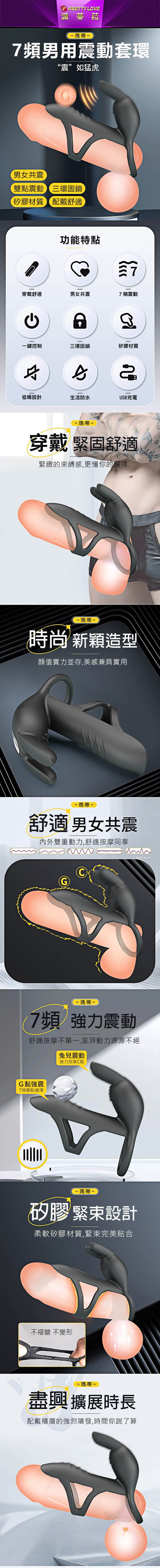 【商品簡介】 用途:男女情趣之用 材質:熱塑性彈性體 規格:電壓3.7V震動/7頻 電源:USB充電 淨重:約77g 總重:約168g 尺寸:長10.5x寬5x高9.5cm,配戴環內徑約4cm.....