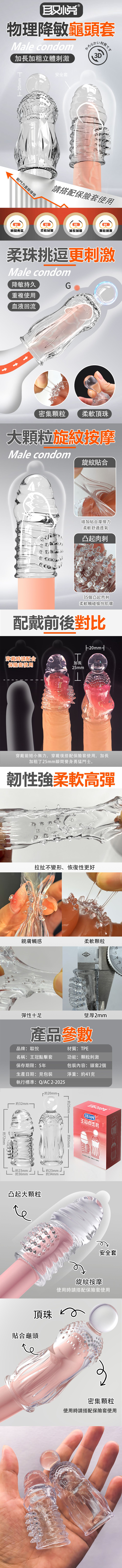 【商品簡介】 用途:男女情趣之用 材質:熱塑性彈性體 規格:穿戴型/安全舒適/2只入 淨重:約41g 總重:約57g 尺寸:頂珠套/長9x寬3.4x深3.4cm,可配戴內長約6cm.....