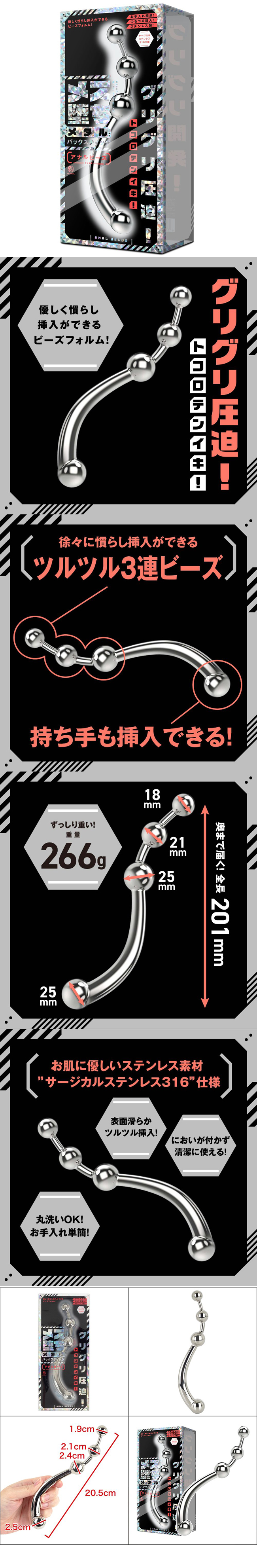 三重珠狀設計,輕鬆順暢插入!也可使用手柄插入,雙向使用不銹鋼材質不留異味,易於清潔!光滑的表面,輕鬆插入,親密接觸!採用316醫用不鏽鋼材質,親膚舒適。檢驗編號:2500389