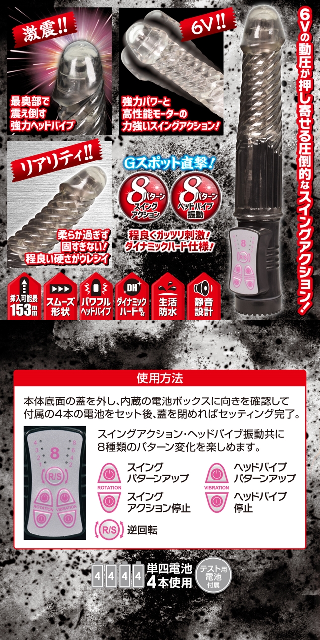【超ド級!6Vヘッドバイブ&スイング一本物バイブ!】中イキに特化したストレートタイプになったガイアバイブ!!8パターンのスイングと振動を個別に操作出来、刺激に変化を与えるリバース機能も搭載。挿入可能長153㎜のストレート形状がスイングしながら最奥のGス〇ットで強力振動するから中派にはたまらない徹底快感を味わえます。衛生的で質感を追求した特殊ラバー素材【ダイナミックハード】採用!
