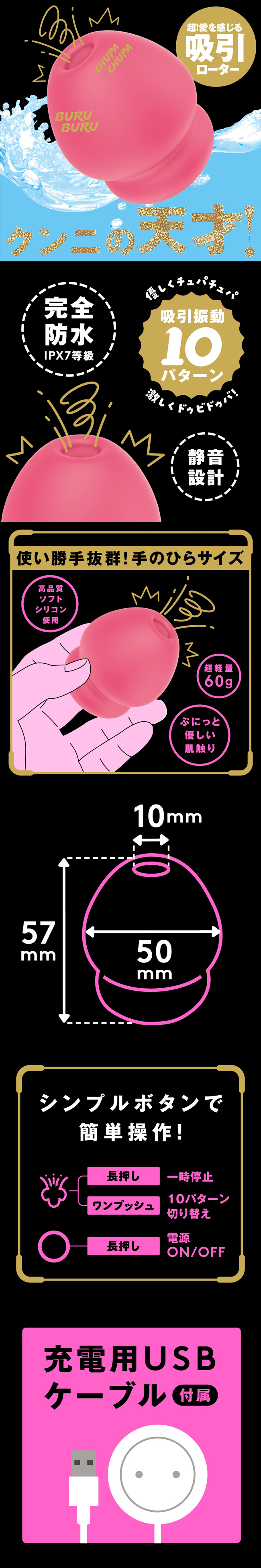 吸陰天才!超級能感受到愛的吸陰跳蛋!又吸又震,絕頂吸陰!從溫柔的親親吸吮到激烈瘋狂的吸吮,總共有10種吸吮模式!使用優質矽膠,觸感Q彈。易於使用的掌心般大小!單純的按鈕操作簡單!完全防水IPX7等級。靜音設計。