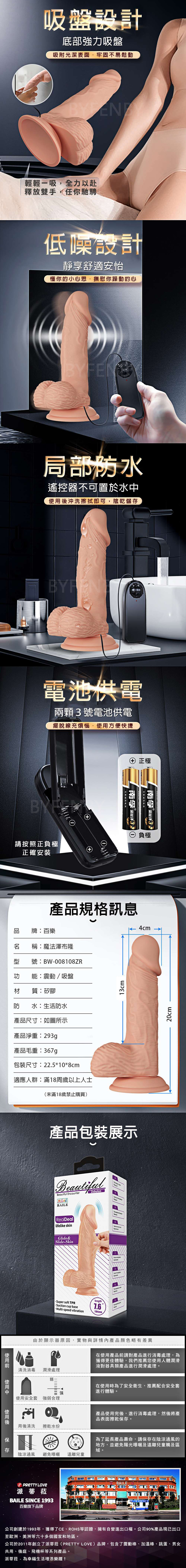 【商品簡介】 用途:女性自慰之用 材質:矽膠+樹脂 規格:電壓1.5V震/微調 電源:3號電池x2顆 淨重:約293g 總重:約367g 尺寸:長20x寬6x深8cm,直徑約4cm 可深入約13cm,吸盤直徑約7.3cm 外盒尺寸:22.5.....