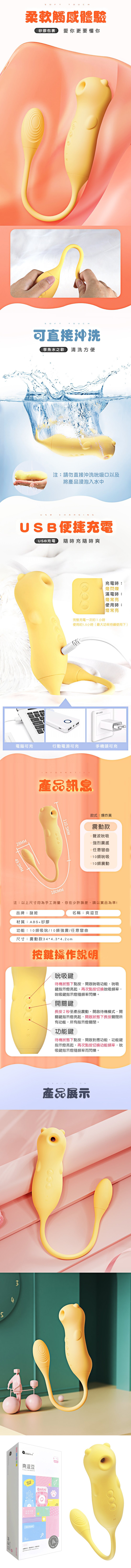 【商品簡介】 用途:女性自慰之用 材質:熱塑性彈性體+樹脂 規格:電壓5V震動/吸吮/黃色 電源:USB充電 淨重:約151g 總重:約216g 尺寸:長34x寬4.3x深4.2cm,蛋徑約2.8cm 蛋長約4.95cm.....