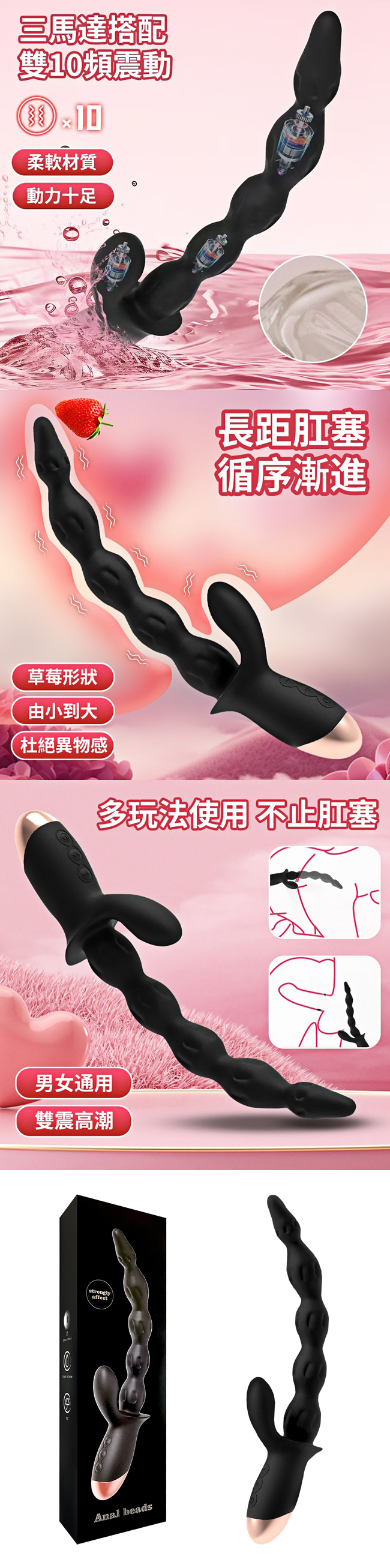 黑草莓是以草莓為造型,5顆草莓由小到大串聯而成,解決了拉珠產品一有異物感的痛點,長度更是適合各種人群的喜好,收放自如;旁邊的震動跳蛋可以震動男人的蛋蛋或女性的陰道,讓全身高潮快感加倍;三個馬達搭配的雙10頻震動,動力十足,一旦入體,高潮刺激的層次感一浪接一浪,彷若過山車般刺激。