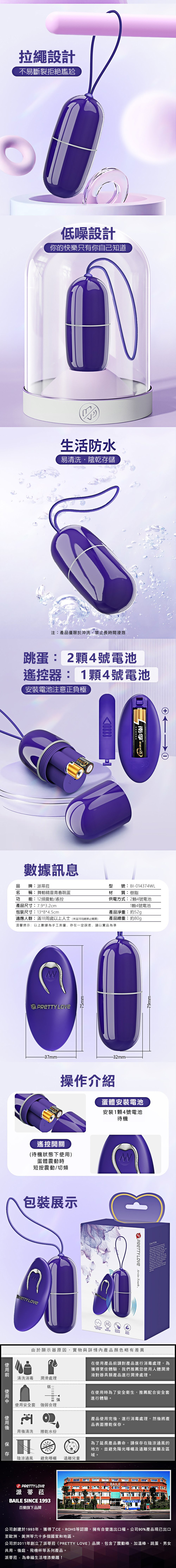 【商品簡介】 用途:女性自慰之用 材質:熱塑性彈性體+樹脂 規格:電壓1.5V震動/12頻 電源:跳蛋/4號電池x2顆,遙控器/4號電池x1顆 淨重:約52g 總重:約80g.....