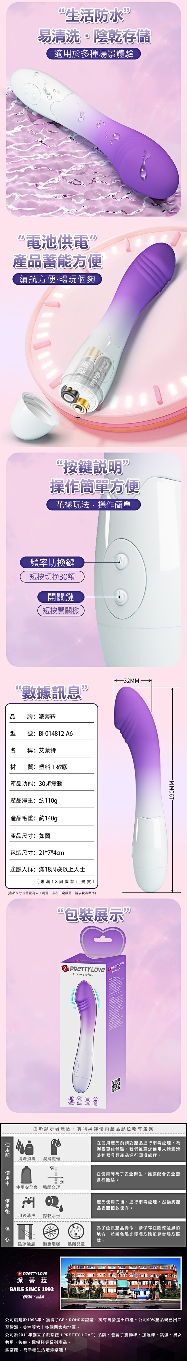 【商品簡介】 用途:女性自慰之用 材質:熱塑性彈性體+樹脂 規格:電壓1.5V震動/30頻/漸變紫 電源:4號電池x2顆 淨重:約110g 總重:約140g.....