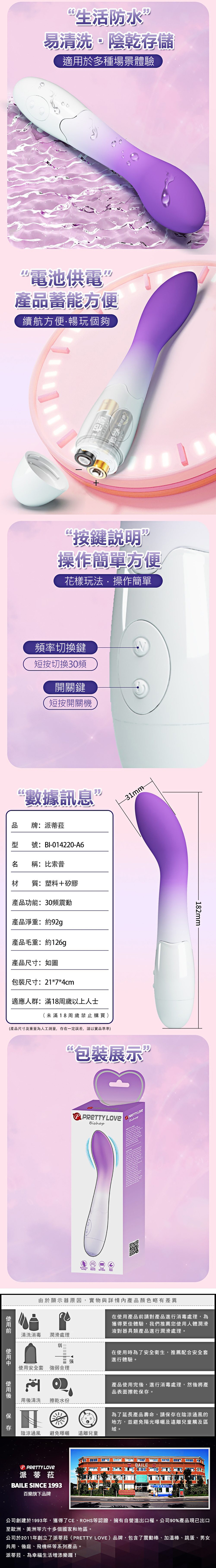 【商品簡介】 用途:女性自慰之用 材質:熱塑性彈性體+樹脂 規格:電壓1.5V震動/30頻 電源:4號電池x2顆 淨重:約92g 總重:約126g.....