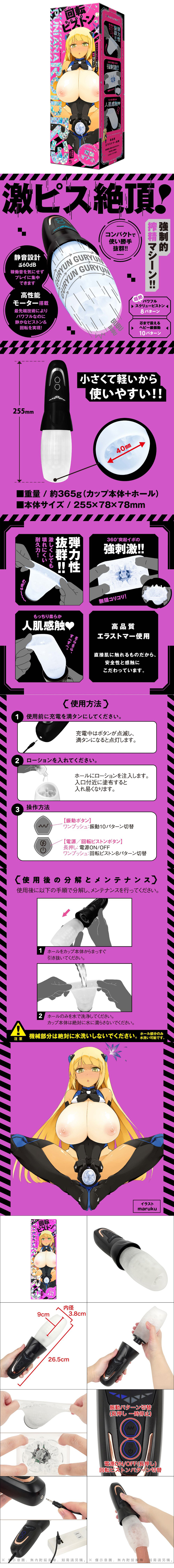 高速旋轉的強力活塞運動!高性能簡約款電動飛機杯登場了!不會覺得厭倦的多慘快感組合【8種旋轉活塞運動】及【10種讓你從內而外享受快感的強力震動】!對小白友善的簡單操作。 2個按鈕輕鬆操作!重量約365給單手操作也方便!只要去下內膽清洗就可以,使用後的處理也簡單!內膽部分的彈性十足,具有很好的耐久性!內部構造為360°的突起疙瘩的強烈刺激!稍大的疙瘩及柔軟又有存在感,使用中也能很好的感受到。因為是直接接觸肌膚的產品,所以採用了高品質的彈性體。可以讓你專心於快感中的靜音設計 ≦60dB。插畫家:maruku