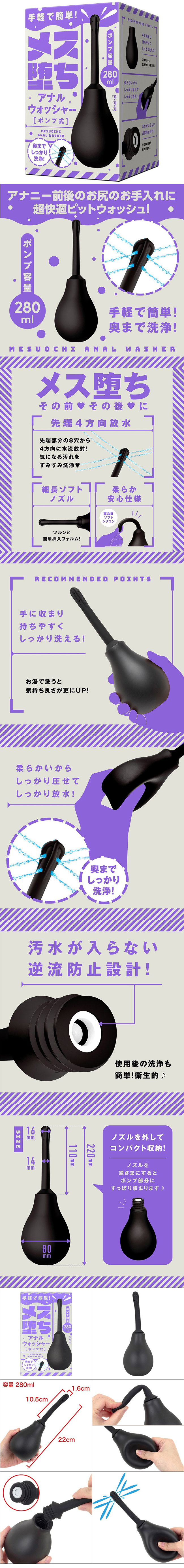 方便又簡單!徹底清潔內心深處!這是一款後庭清洗器,可讓您在後庭享樂的前後進行非常舒適的清洗。前端的8個孔向4個方向噴水,細節清洗您在意的髒污部分。細長的軟噴嘴,其形狀易於插入。 採用優質軟矽膠製成,柔軟安全。幫浦容量為280ml,適合手持的尺寸,易於握持和徹底清洗!用溫水清洗會更舒適。幫浦也很柔軟,用力按壓即可釋放內存的水。防止回流的設計可以防止污水倒流,使用後清洗方便又衛生。 噴嘴可以拆卸方便收納,便於保管!