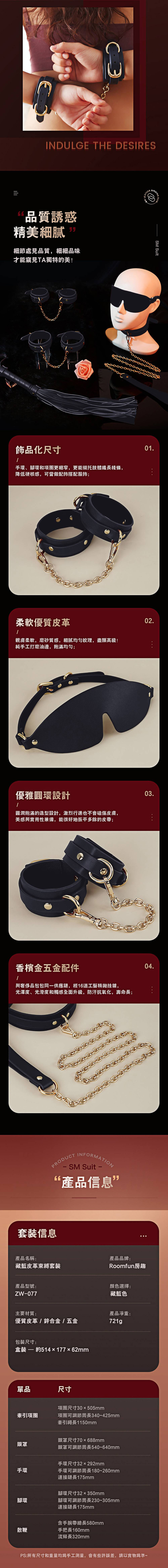 內容物:眼罩x1、牽引繩x1、項圈x1、手銬x1對、腳銬x1對、連接鍊x2、散鞭x1