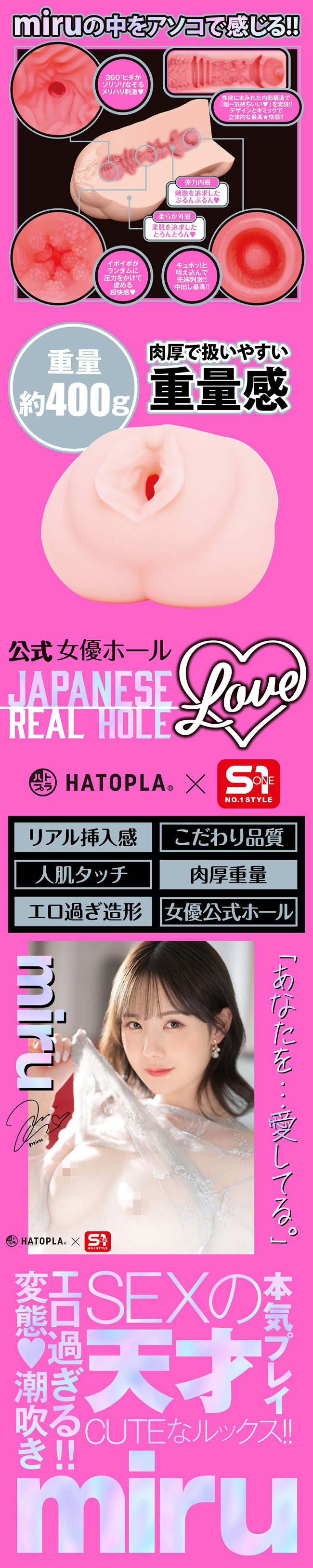 【商品簡介】 AV女優官方飛機杯「JAPANESE REAL HOLE LOVE_」可愛的顏值!喜歡刺激_SEX Level MAX! !盡情享受miru的私密部位!重現了宛如直接插入充滿性慾設計和機關的『追求柔嫩肌感的黏滑柔軟外層』.....