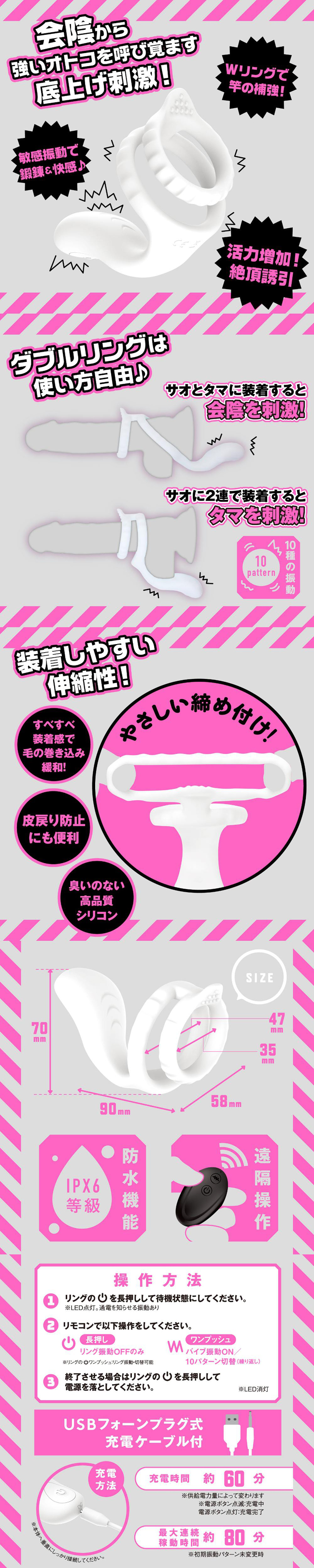 以敏感震動帶來鍛鍊與快感會陰部貼合震動馬達,帶來提升式刺激,喚醒強勁活力!另外可透過遙控器操作10種震動模式,自由掌控高潮時機。高品質柔軟矽膠雙環設計,溫柔固定,同時透過根部適度壓迫提供支撐感。可雙環疊戴使用,也可分別佩戴於不同部位,使用方式自由。帶來更強烈的釋放體驗,慢慢沉浸於愉悅之中本體為充電式設計,環保又方便。