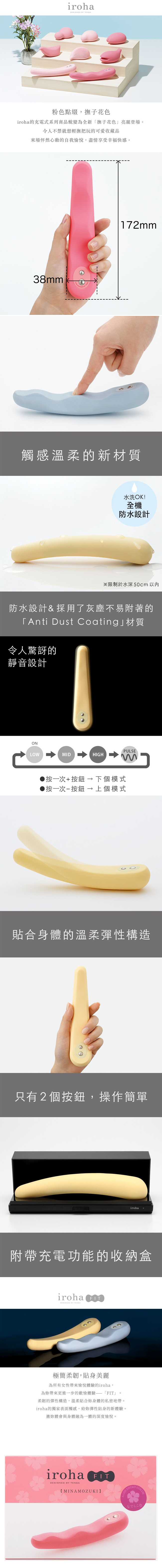 為了給所有女性帶來「愉悅」而誕生的IROHA 第三彈推出了長條形的產品--FIT, 柔軟柔韌的構造,輕鬆貼合與身體相融,使用最新的頂級柔肌素材,最頂級的觸感呵護女性最私密的身體,柔軟卻不失硬度,可以帶給女性朋友最愉悅的快感,極靜音的設計加上全防水設計,不論是在任何場合都能儘性的享樂,棒身內置的靜音震動器可透過棒身底部的2個按鈕來控制,共有4種震動模式,可滿足各種須求的女性朋友。