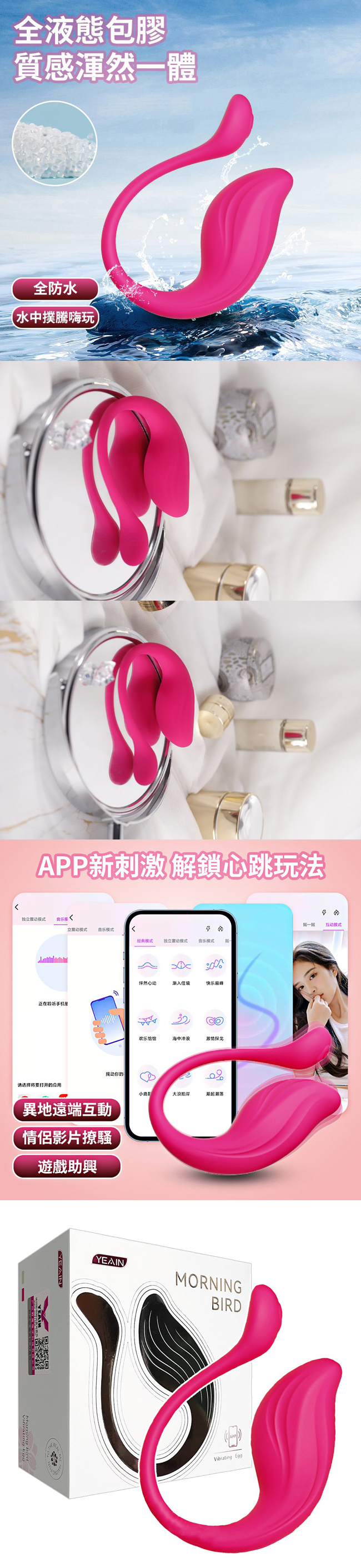 晨鳥是以歐洲知更鳥為原型的跳蛋,馴良而熱情,旨在傳遞女性亦如晨曦中的鳥一樣,充滿活力與對美好的渴求,造型上清新如雨,功能上9頻震動,多種程度的悸動體驗一定能讓你發出如晨鳥般愉悅的聲音。 全包膠工藝高級別防水,在水中盡情嗨趣,驚起一朵朵浪花…