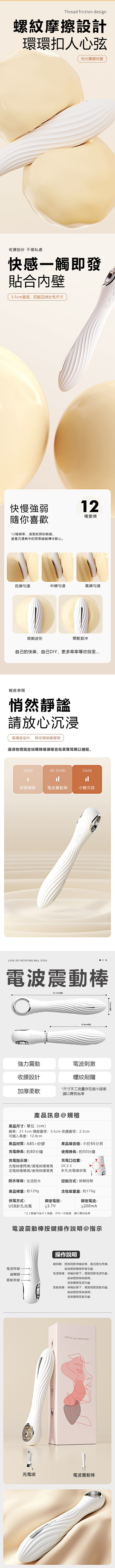 【商品簡介】 用途:女性自慰之用 材質:熱塑性彈性體+樹脂 規格:電壓3.7V震動/電波/12頻 電源:USB充電 淨重:約129g 總重:約176g 尺寸:長21.1x寬3.5x深4.2cm,最大徑約3.5cm 可深入約12.8cm.....