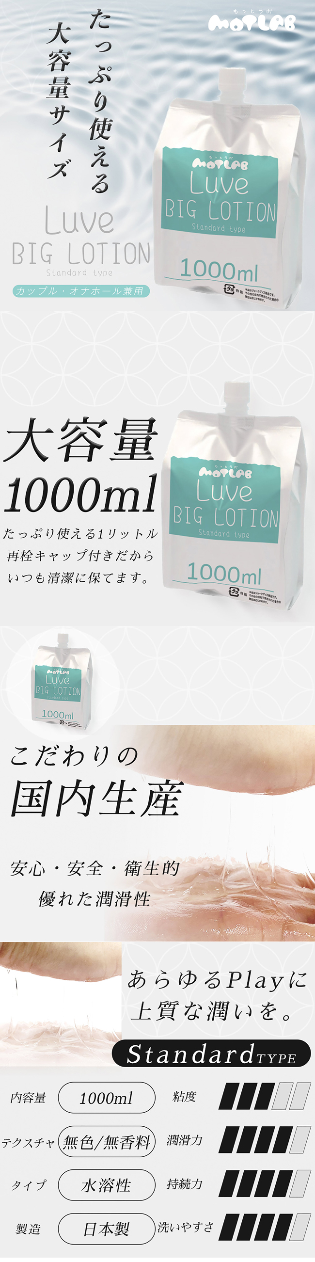 具有優異的潤滑性和耐久性,可用於成人用品、情侶使用等各種遊戲。僅使用安全成分在國內工廠生產,衛生和品質方面您可以放心使用。它配有補充蓋,因此您可以隨時乾淨地使用它,並且使用後可以緊湊地折疊起來,方便處理,不佔用太多空間。