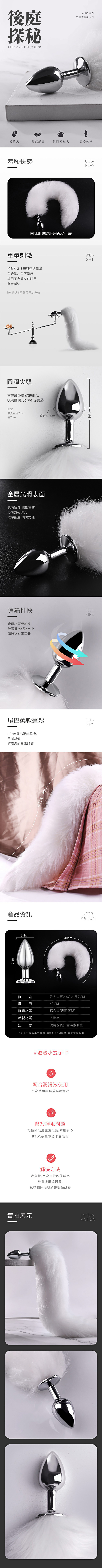 【商品簡介】 用途:男女情趣之用 材質:金屬+假毛 規格:手動型/安全舒適/白 淨重:約90g 總重:約138g 尺寸:肛塞/長7x寬2.8x深2.8cm,最大徑約2.8cm 可深入約6cm    尾巴長(不含肛塞)約40cm 外盒尺寸:1.....