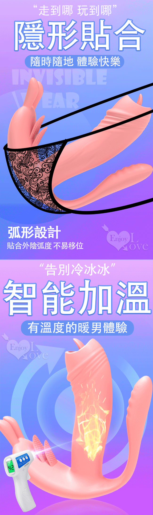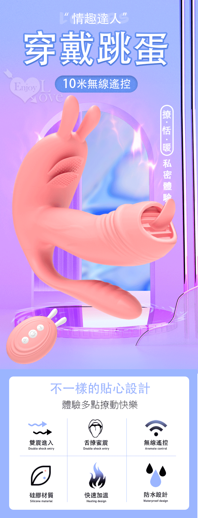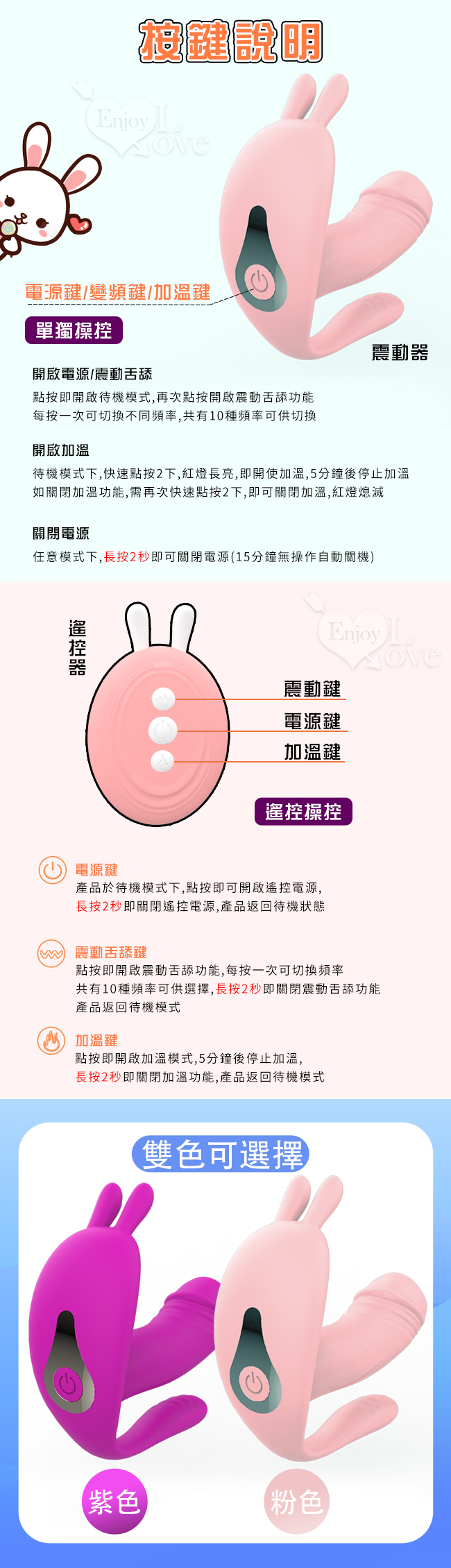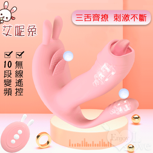 【商品名稱】 艾妮兔 ‧ 3點齊震10段變頻無線遙控多功能按摩器﹝集撩舌震動加溫穿戴內外雙震於一身﹞粉色