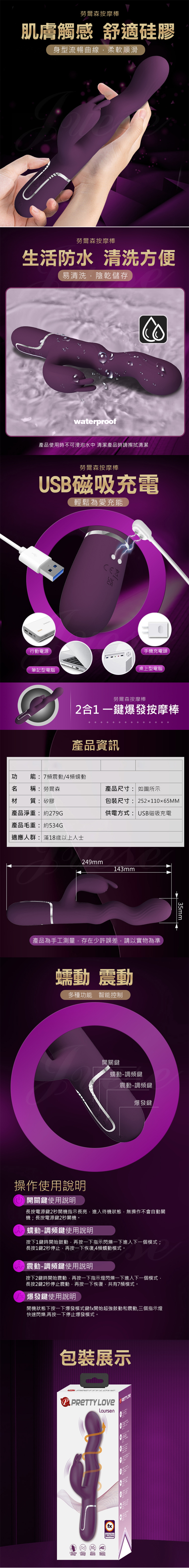 【商品簡介】 用途:女性自慰之用 材質:熱塑性彈性體 規格:電壓3.7V震動/4x7頻 電源:USB充電.....