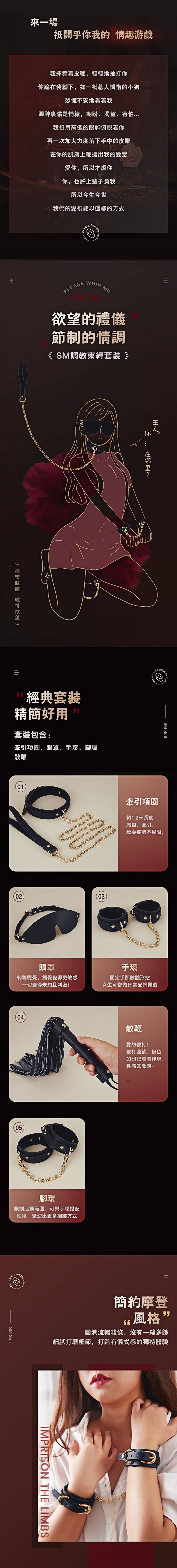 內容物:眼罩x1、牽引繩x1、項圈x1、手銬x1對、腳銬x1對、連接鍊x2、散鞭x1