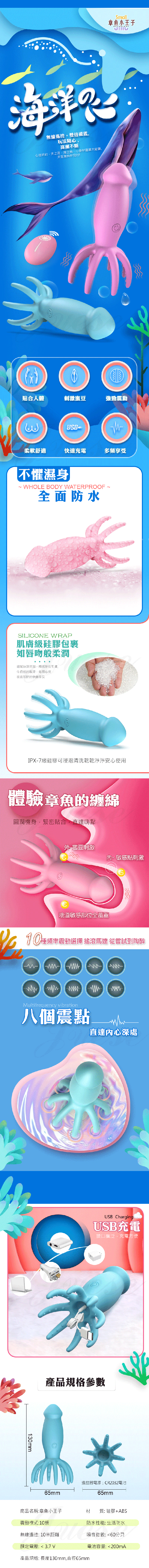 章魚王子 10段變頻八爪震點刺激蜜豆遙控USB充電按摩棒﹝男女通用﹞-海洋藍
